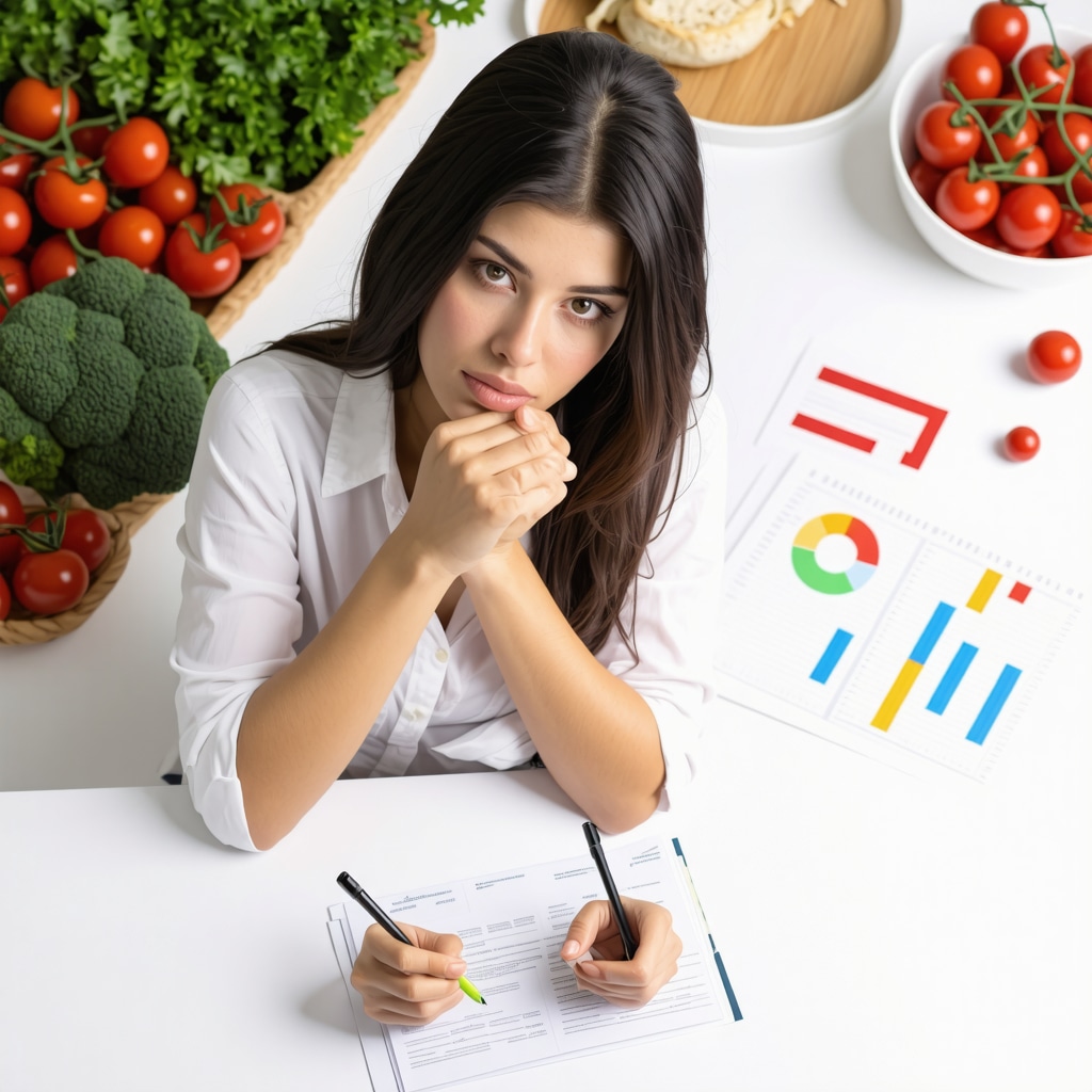 Person journaling about appetite suppressant journey with nutritious foods and medical charts in background